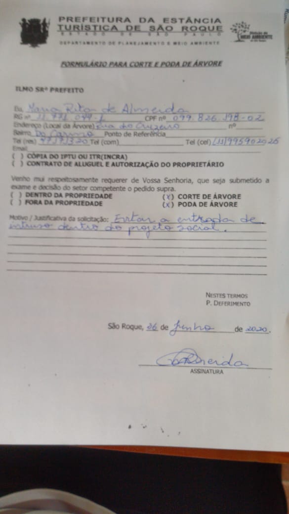Assunto: Documentos Final Digitalizado ao Ofício Vereador Nº 698/2020 - Solicita a realização de poda ou corte de árvore localizada na Rua do Cruzeiro, bairro do Saboó, conforme pedido em anexo, da moradora do local (documento anexo)