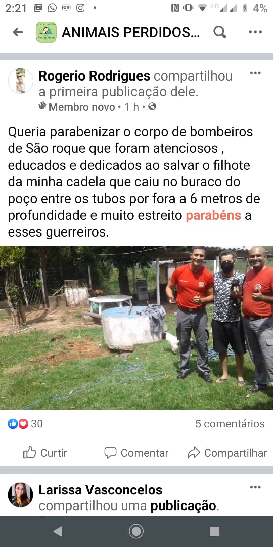 De Congratulações aos Bombeiros de São Roque que resgataram um filhote de cão do fundo de um buraco ao lado do poço de 6 (seis) metros de profundidade