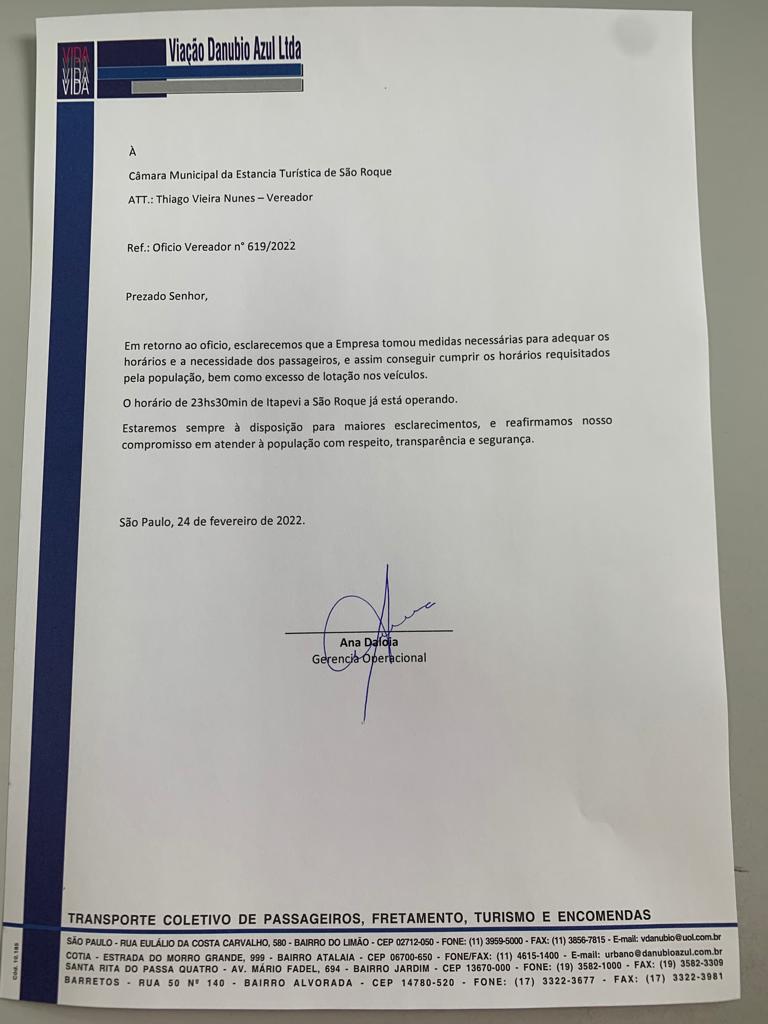 Resposta ao Ofício Vereador Nº 619/2022 - Solicita a Empresa Danúbio Azul que retorne a linha de Itapevi a São Roque no horário da 23:30