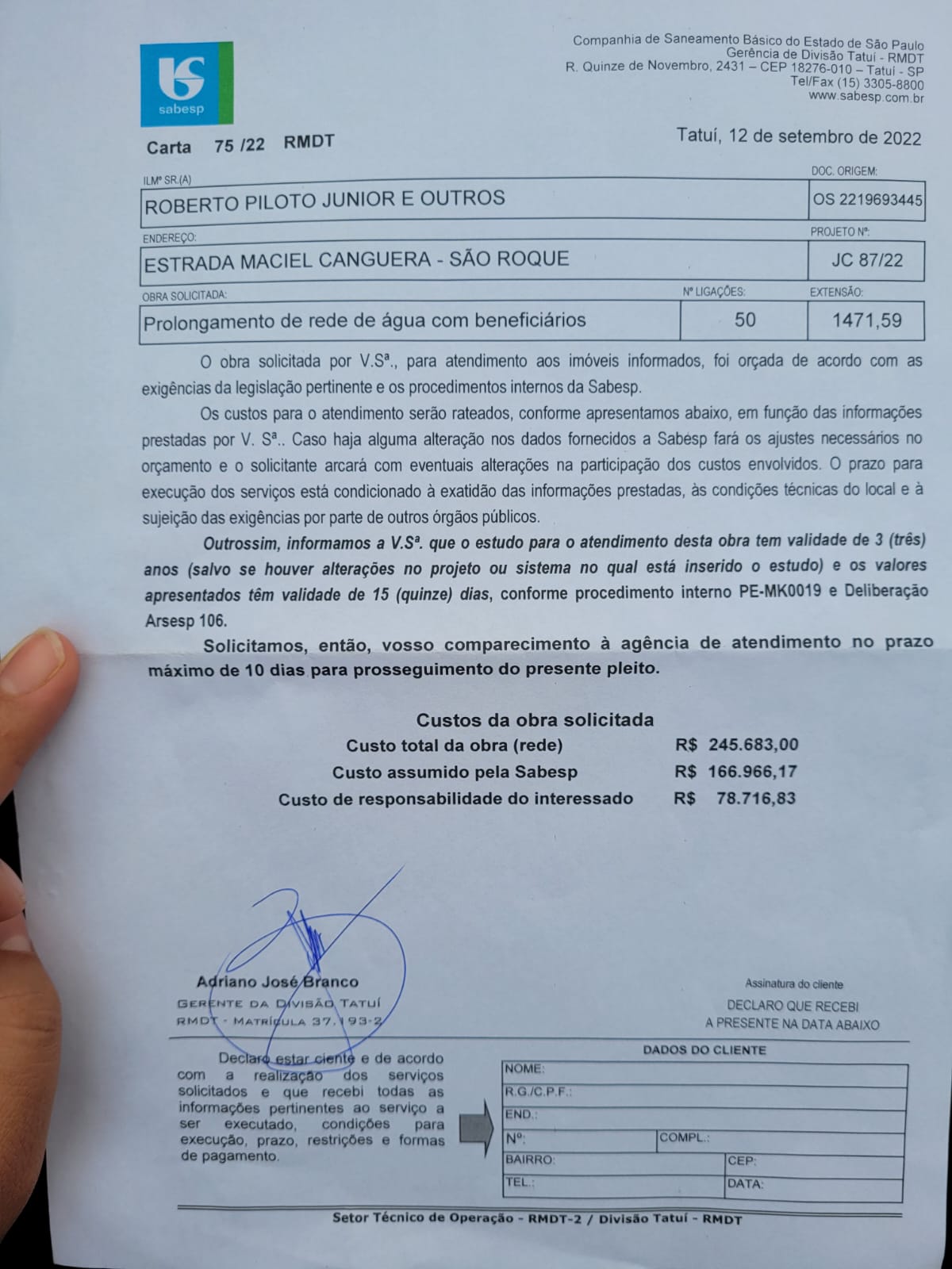 | Documentos Final Digitalizado Nº 1 ao Ofício Vereador Nº 1803/2022 | 30/09/2022 | Documentos Final Digitalizado ao Ofício Vereador Nº 1803/2022 - Solicita a SABESP implantação de prolongamento de rede de água na Estrada Maciel, no Bairro Canguera, São Roque, conforme carta 75/22 expedida pela SABESP. |