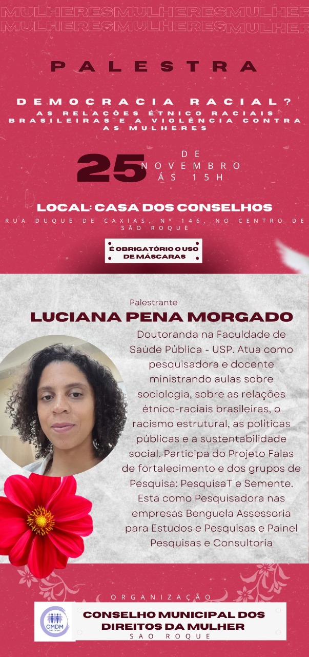 De congratulações à Luciana Pena Morgado, pela palestra ministrada no Conselho Municipal dos Direitos da Mulher de São Roque, com o tema "Democracia Racial? - As relações étnico raciais brasileiras e a violência contra as mulheres"