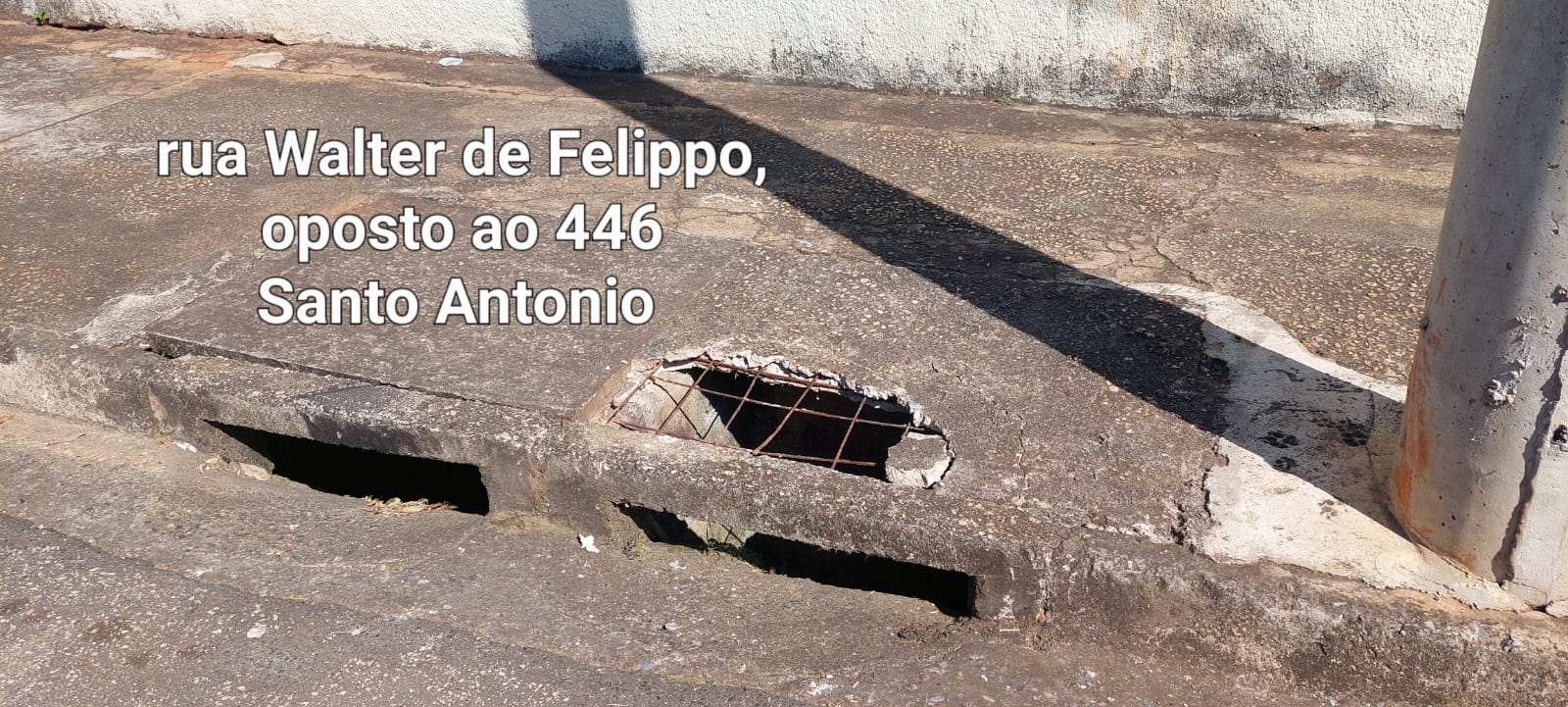 Assunto: Solicita ao Departamento de Obras a troca da tampa do bueiro existente na Rua Walter de Felippo, oposto ao nº 446, Santo Antônio