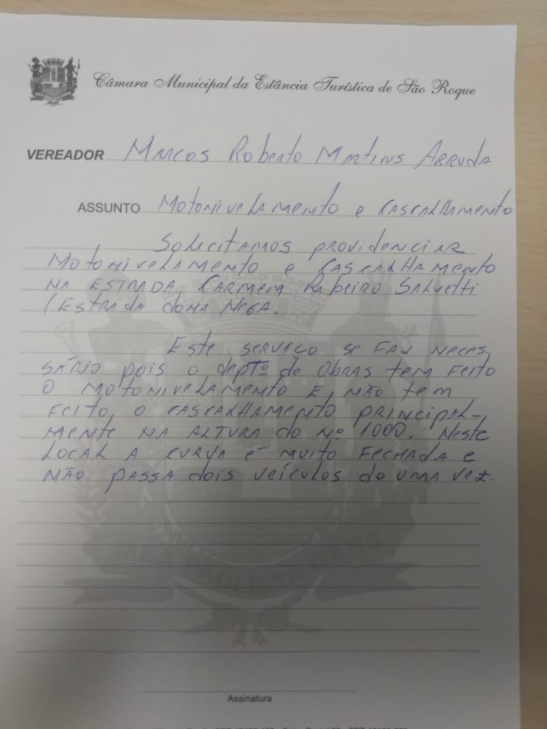 Assunto: Solicita ao Poder Executivo motonivelamento e cascalhamento da Estrada Carmem Ribeiro Salvetti, conhecida como Estrada da Dona Nega