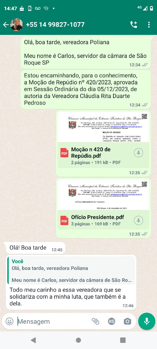 | Resposta Nº 1 ao Ofício Presidente Nº 734/2023 | 06/12/2023 | Resposta ao Ofício Presidente Nº 734/2023 - Encaminha Moção Nº 420/2023. De Repúdio ao Vereador José Carlos Fantin (PTB), por postura agressiva contra a Vereadora Poliana Quirino (PSL), durante sessão da Câmara Municipal de Barra Bonita (SP) | |
