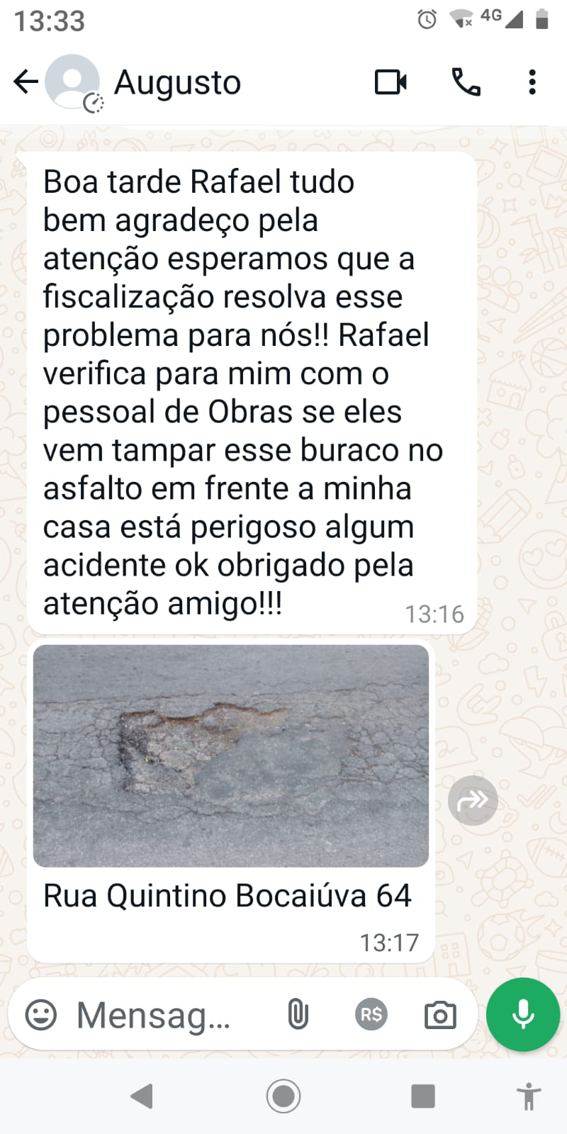 Assunto: Solicita tapa buracos para a Rua Quintino Bocaiúva, nº 64
